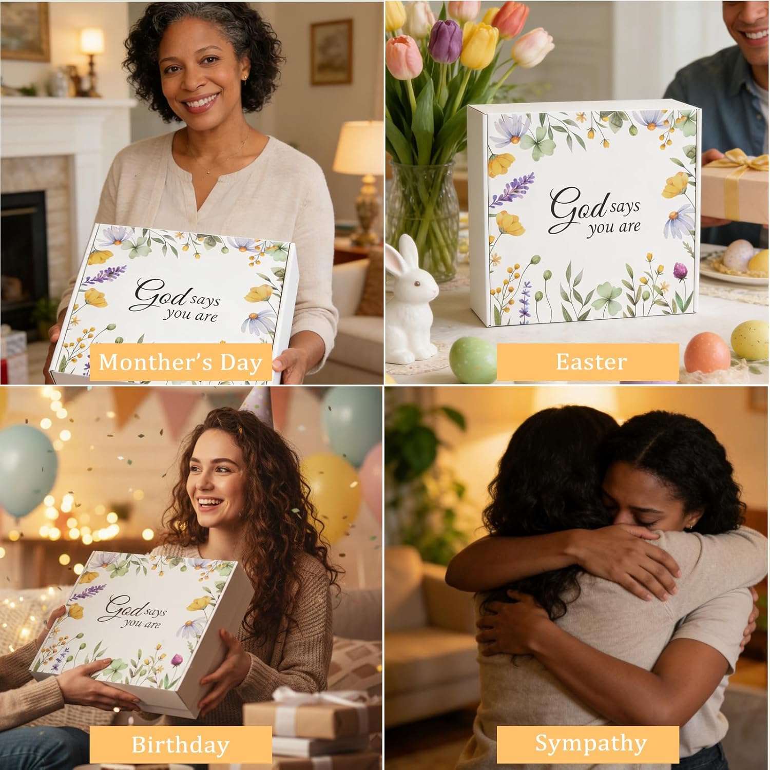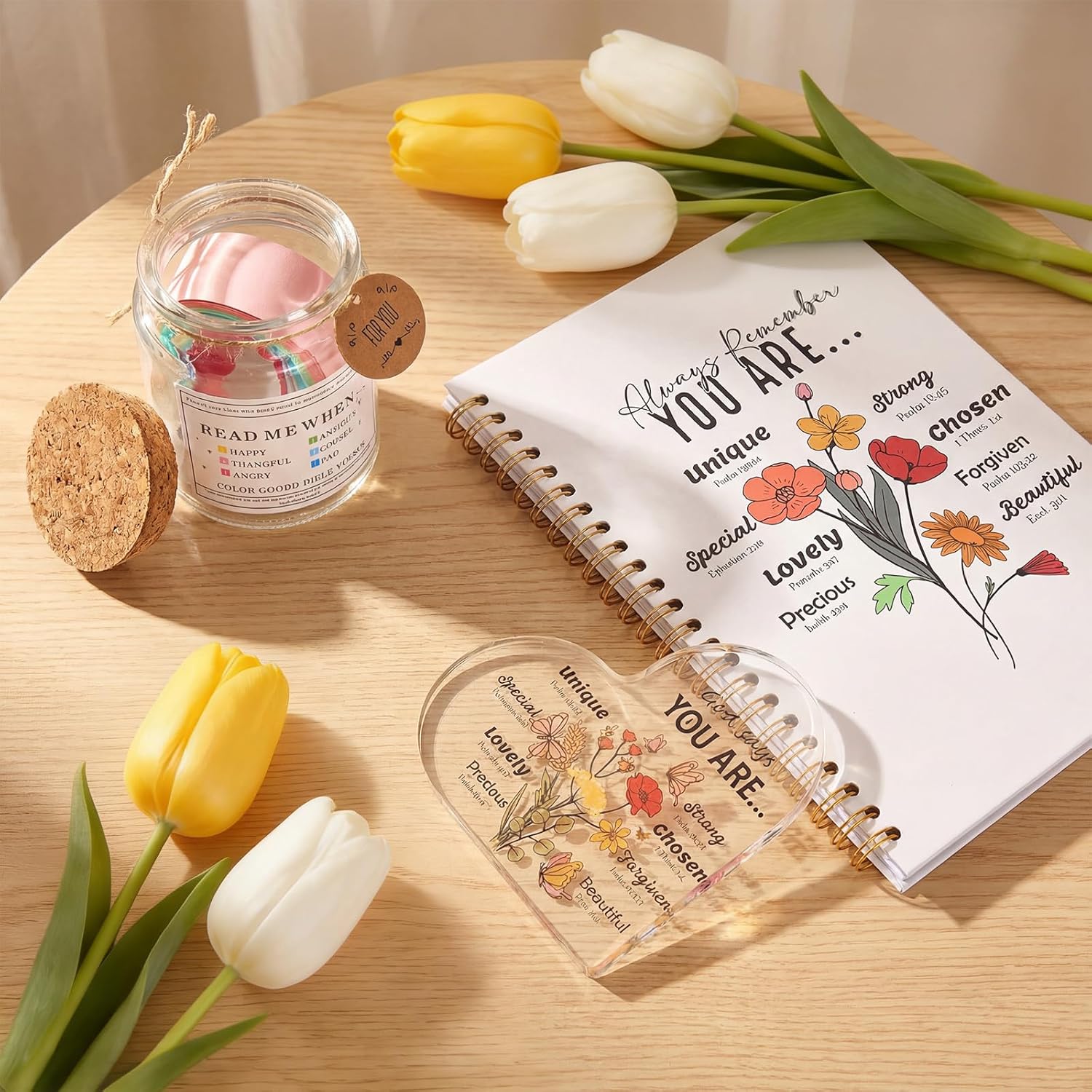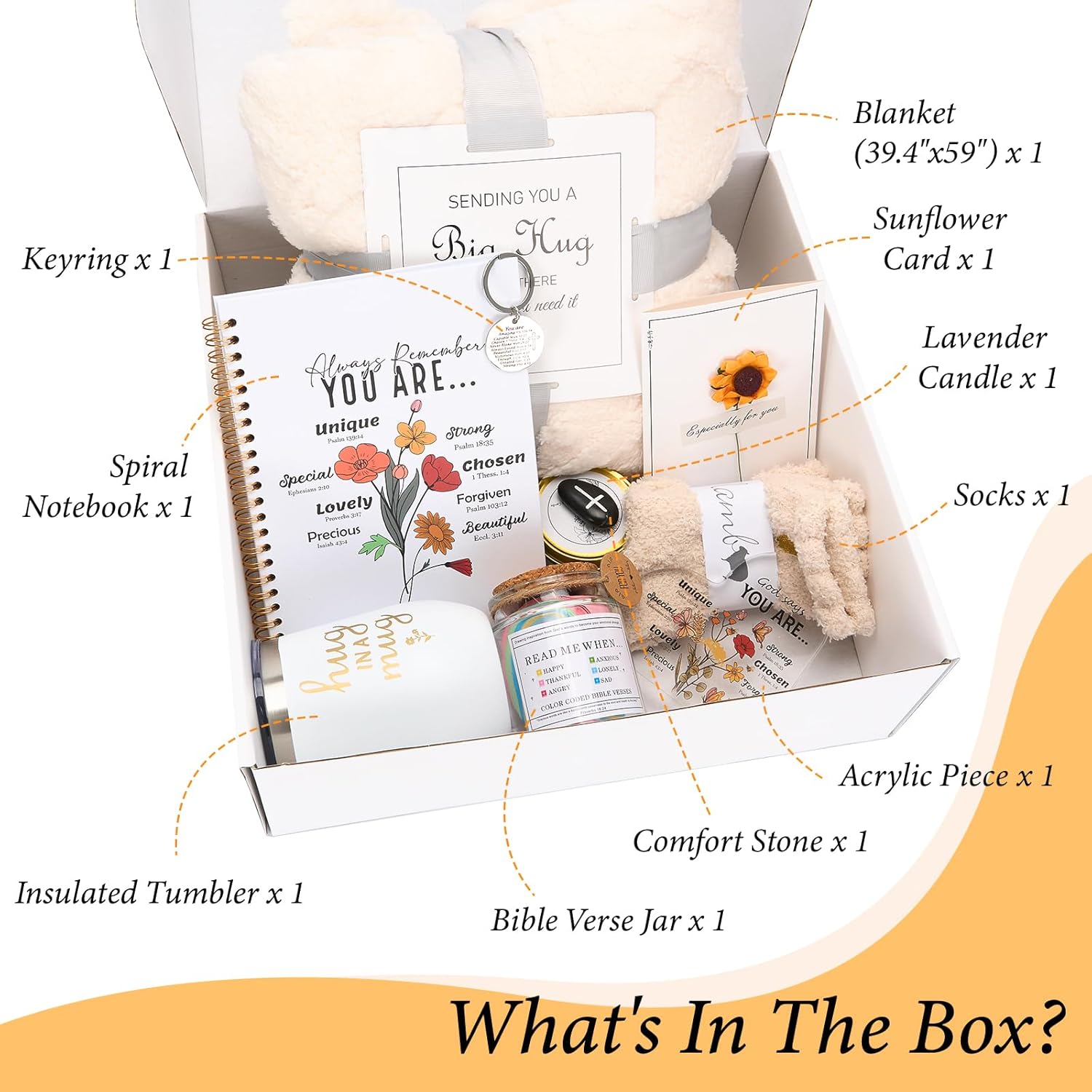 | Included Components | Bible verse jar & Lavender-scented candle x 1, Blanket & Fleece socks x 1, Insulated tumbler x 1, Keychain & Comfort stone & Sunflower greeting card x 1, Notebook & Acrylic decor x 1 |