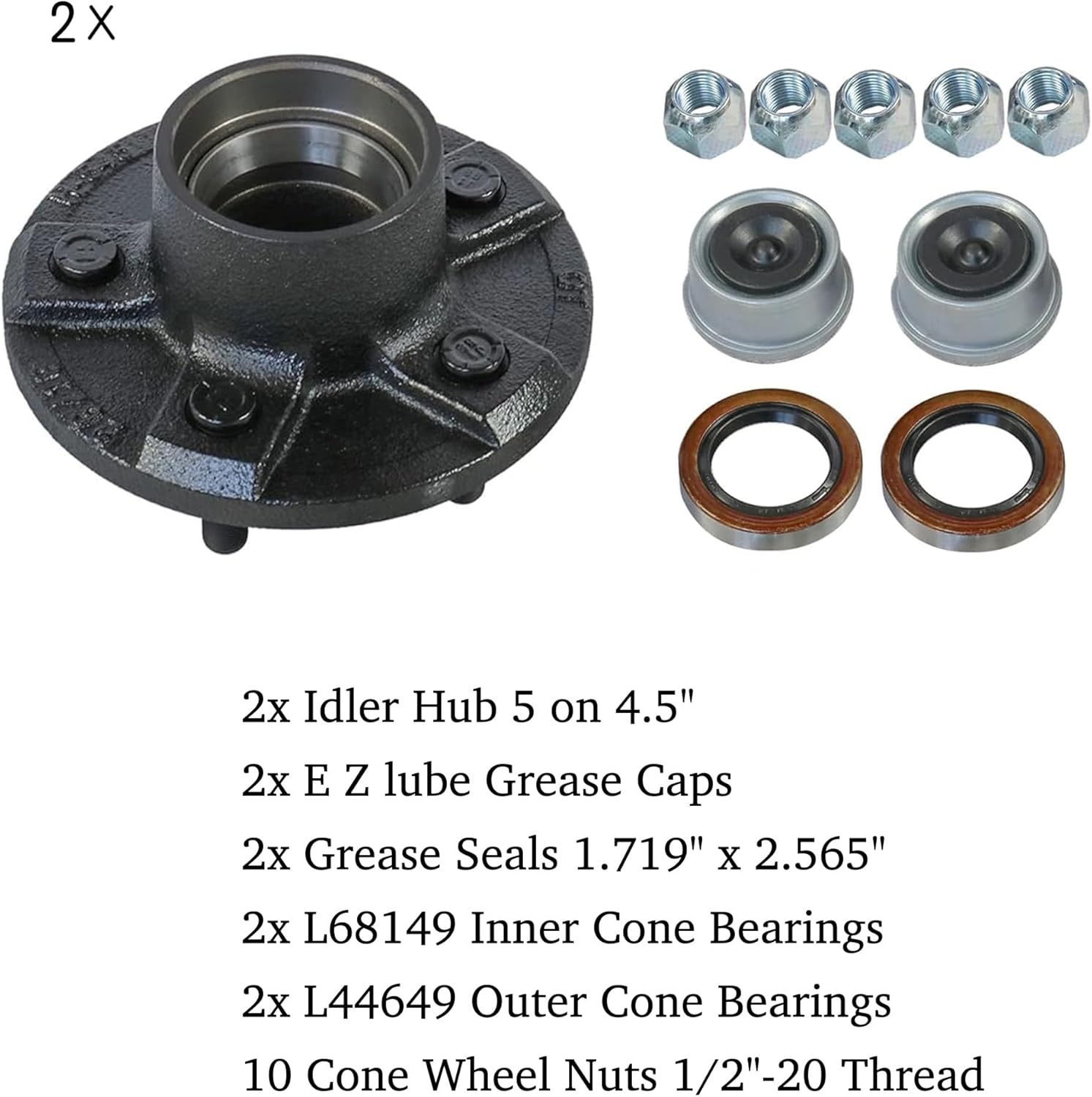 Parameters - Capacity: 3,500 lb axle (pair of hubs) - Bolt Pattern: 5 on 4.5 in - Spindle Type: #84 - Brake Flange: 4-hole - Inner Bearing: L68149 (cone) - Outer Bearing: L44649 (cone) - Grease Seal: 1.719 in I.D. × 2.565 in O.D. - Grease Cap: E-Z Lube with rubber plug - Wheel Stud: ½ in-20 thread, pre-installed - Lug Nuts: 10 pcs, ½ in-20, cone-seatPACKAGE2 idler hubs4 taper bearings2 double-lip grease seals2 E-Z Lube chrome caps10 cone-seat lug nutsReplace the hub kit when you notice:- growling/hot hub - gritty or watery grease - loose/wobbly wheel - cracked hub or spun studs or every 5 yrs/12k mi—whichever comes first.Safety quick list - Block wheels & use stands – no jack-only support - Wear glasses/gloves; clean spindle & bearings spotless - Seat races square; pack grease until it purges - Torque nut 50 ft-lb seat, back off, finger-tight + ⅙ turn; cotter pin free - Spin hub—smooth, no wobble; cap/plug fully seated - Hand-start lugs, final torque 90–100 ft-lb; re-check at 50 mi