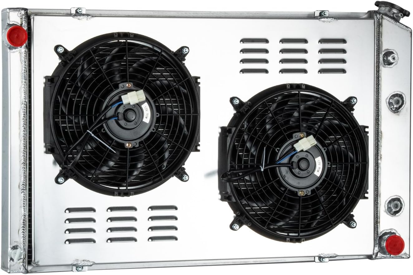 Vehicle Fitment For 1985 1986 1987 Chevy Pickup Truck 19" Core For 1981- 1991 Chevy Truck (21" x 33") For 1973-1991 Chevy Suburban For 1973-1991 Chevy Blazer / Jimmy For 1973-1987 Chevy Pickup Trucks For 1981-1990 GM Truck 5.7 7.4 For 1985 1986 GMC C2500 C3500 K1500 K2500 For 1981-1990 Chevy R Series For 1981-1990 Chevy K Series For Chevy For GMC Blazer Jimmy Suburban For 1973-1987 Chevy Truck, 1973-1991 Blazer (19 x 28-1/4" Core) For 1973-1991 Chevy C/K Series Trucks For 1973-1981 K5 Blazer For 1973-1980 CHEVY C/K SERIES C10/C20/K10 PICKUPManufacturer Part Number: 716,CC716,CU716,RAD716,DPI716,MC716,SBR716,KKS716 Other Part Number: CU844, SPTCU716, 2308, 40385, 0AAS0778, 433716 Interchange Part Number: CU1599, EC716, 1599, B1599, B716, MC716, 1605-37020 Radiator Specification 4 Row of tubes Core Racing Design Mounting Type : Saddle Surface finish: Aircraft 5057 grade aluminum tank & core Petcock Drain: OEM style brass petcock drain Fans Details Maximum Fan CFM: 1730 cfm Fan Diameter (in): 12.050” Thickness (in): 2.500” Number of Blades: 10 blades Maximum Fan RPM: 2,250 rpm Blade Material: Plastic Amp Draw: 12.70 amps Includes the Mounting Tabs for an Easy Zip Tie Installation Thermostat Kit RED + connect directly to battery. WHITE wire to ignition switch power source. BLACK goes to thermos switch. BLUE wire goes to the Fans. Package Include: 1 X 4-Row Aluminum Radiator 1 X Aluminum Shroud 2 X 12" Fans