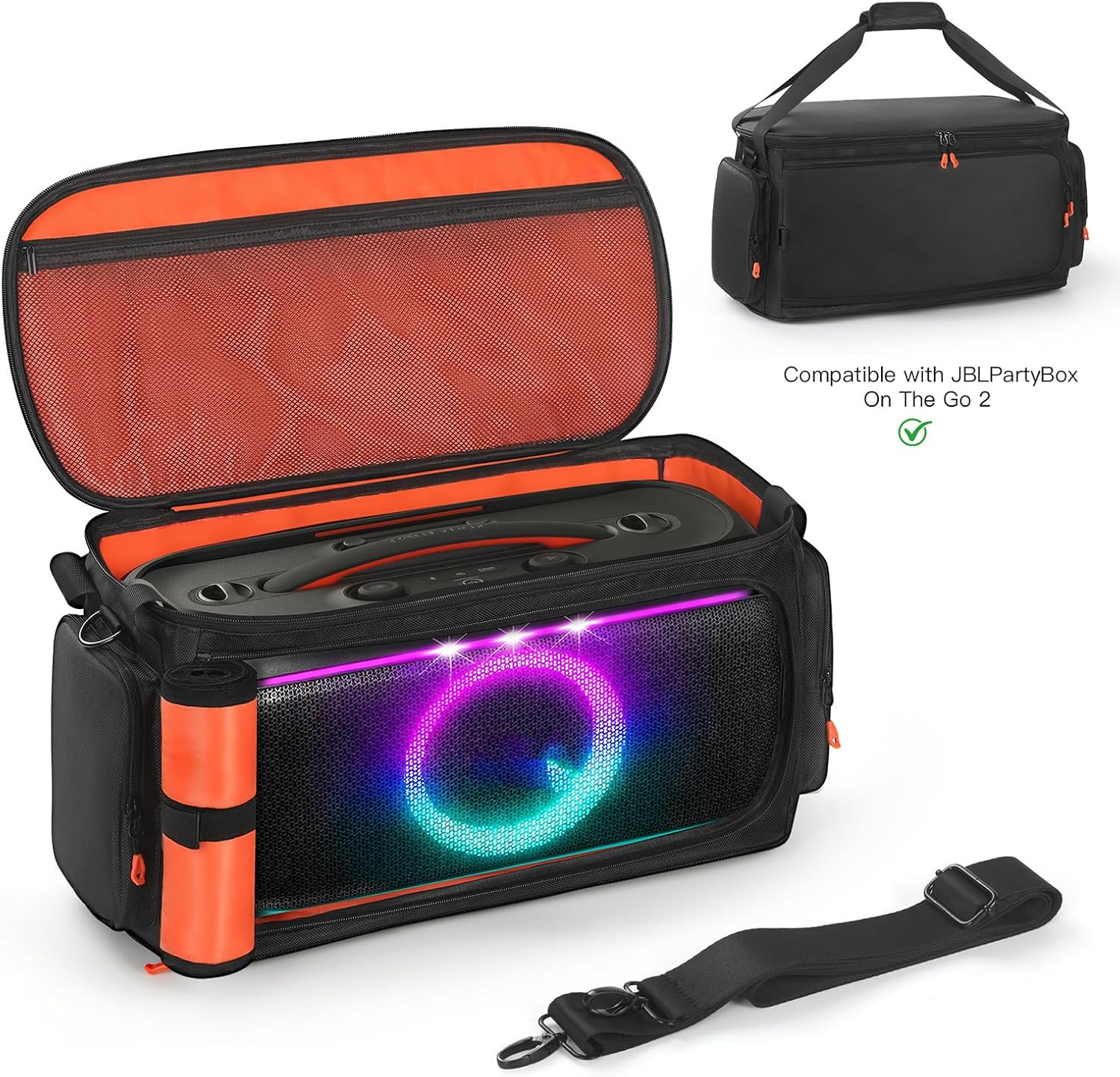 Specification:Material: Polyester FabricColor: BlackWeight: 1200gQuantity: 1 SetApplicable Model: Compatible with JBL PartyBox On-The-Go 2/On-The-Go/On-The-Go EssentialPackage:1x Carrying Case + 1x Shoulder StrapNote:Only the above package content, other products are not included.