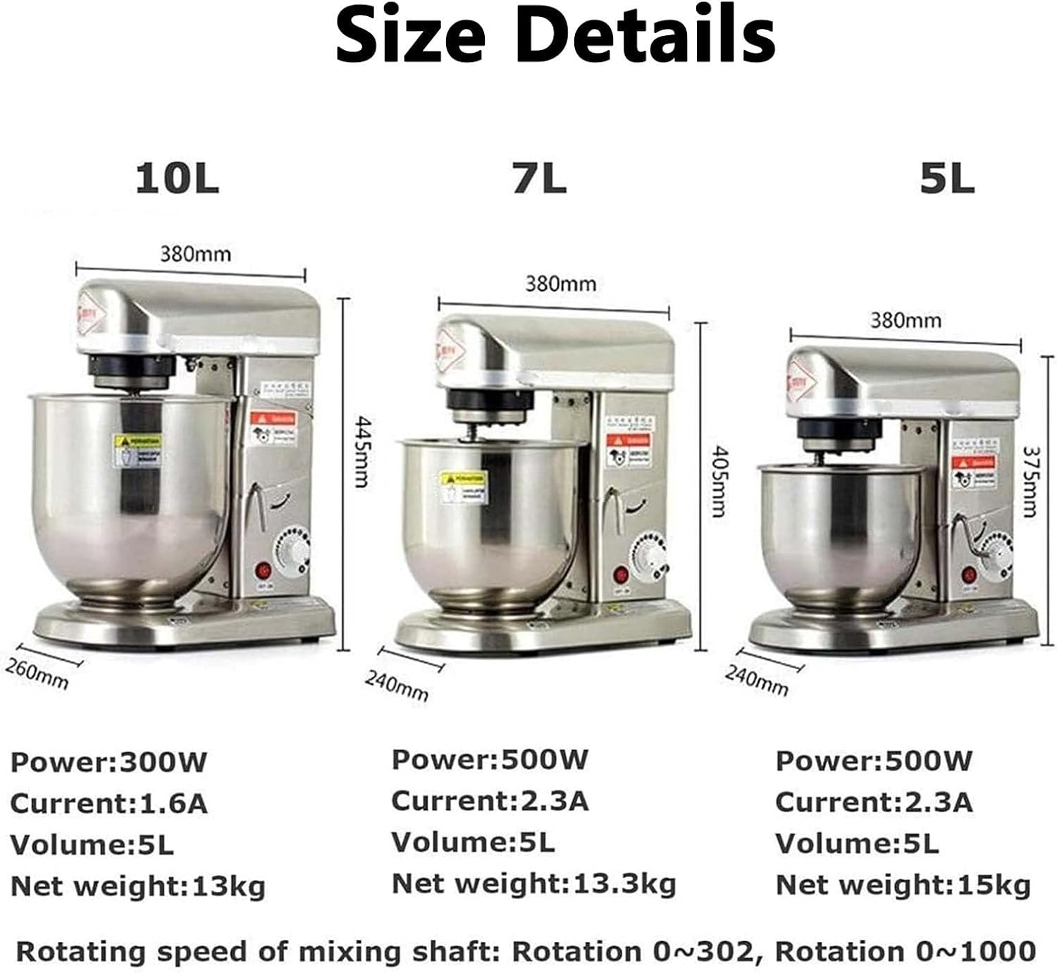Are you still about your wrists aching from kneading dough and the time-consuming and labor-intensive whisking of egg whites?Electric stand mixer, 3-speed adjustment + planetary stirring, from chewy noodles to dense ice cream, from fluffy egg whites to flexible bread dough, all are easily mastered! Start your journey of gourmet creation!Features and functions:- Prepare dough, cakes, and bread- Whip egg whites, sponge cakes, or whipped cream- Mix and knead dough for waffles, pasta, or pancakes- Achieve precise mixing, covering all areas of the mixing bowl evenly- The anti-slip suction feet are responsible for keeping the kitchen mixer standing still, even when it is workingSpecifications:Name: Food Stand MixerMaterial: Stainless SteelVolume: 5L,7L,10LPower: 350W,500WNet weight: 13kg,13.5kg,15kgStirring axis speed rotation: 0 ~ 302, self -turn 0 ~ 1000Package:1 * Standing Mixer1 * Mixing bowl1 * Mixing paddle1 * Egg beater1 * Irregular dough hookCustomer Service:If you have any questions about the product, please send us an email in time and we will answer your questions as soon as possible.