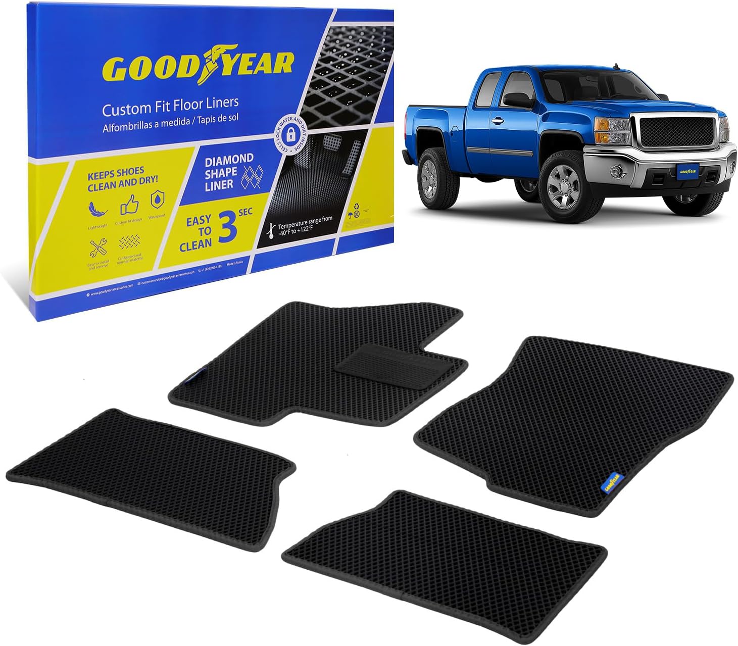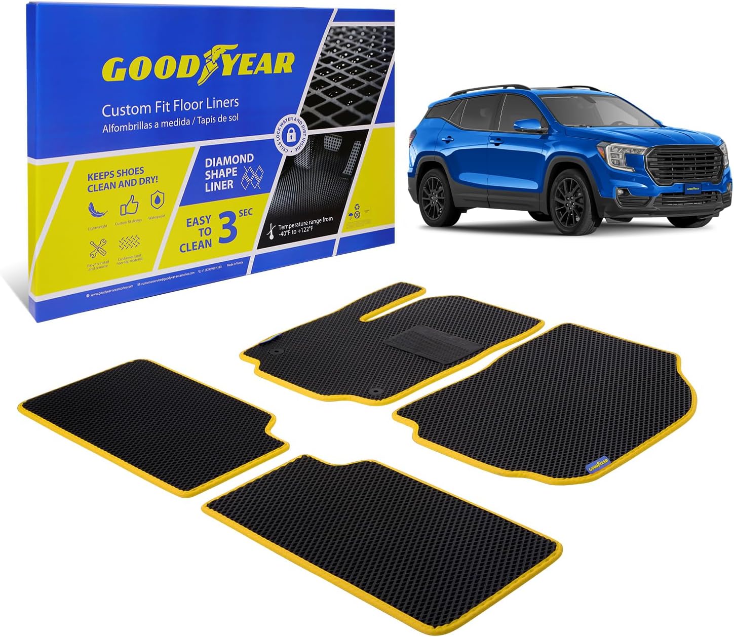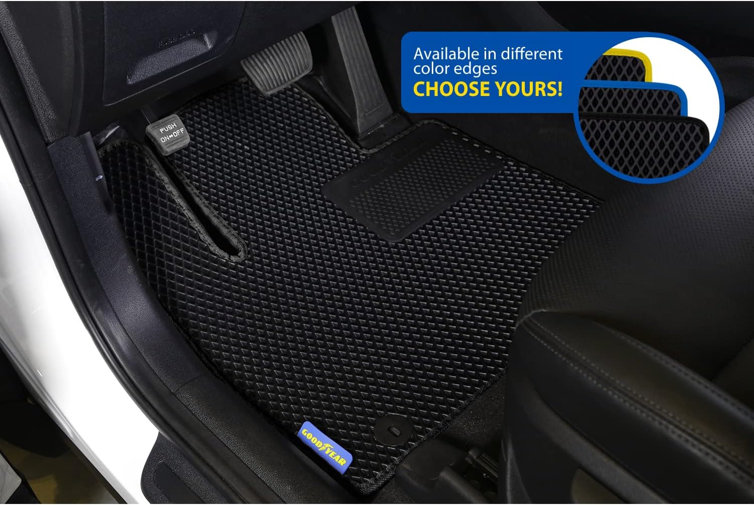 Upgrade your car’s interior with Goodyear all-weather car floor mats – the ultimate solution for protecting your vehicle’s floors from dirt, mud, spills, and wear. Whether you're a daily commuter, weekend adventurer, or truck enthusiast, these automotive floor mats provide unmatched durability, coverage, and convenience. Made with premium heavy-duty, environmentally friendly material, our floor liners feature Diamond Shape technology, effectively trapping water, dirt, and debris to keep your car clean. A slip-resistant backing with secure fasteners ensures these car mats stay in place, even during rugged off-road trips. The reinforced heel pad in the pedal area adds extra durability, making these truck accessories for men and women a must-have for any driver. Goodyear Precision-Fit Floor Mats (Black 4 Pc. Set). All-Weather, Heavy-Duty waterproof mats. Anti-Slip Mesh Backing with Secure Fasteners. Diamond Shape Technology for Maximum Dirt & Liquid Containment. Easy to Clean – Shake Out or Hose Down. Includes Front and Rear Liners. Strong, reliable and permanent car accessories. Bonus: Two (2) Complimentary Goodyear License Plate Frames. Enhance your driving experience and keep your car cleaner with these premium floor mats for SUVs, trucks, and cars. Click Add to Cart now and upgrade your vehicle with high-quality car accessories!
