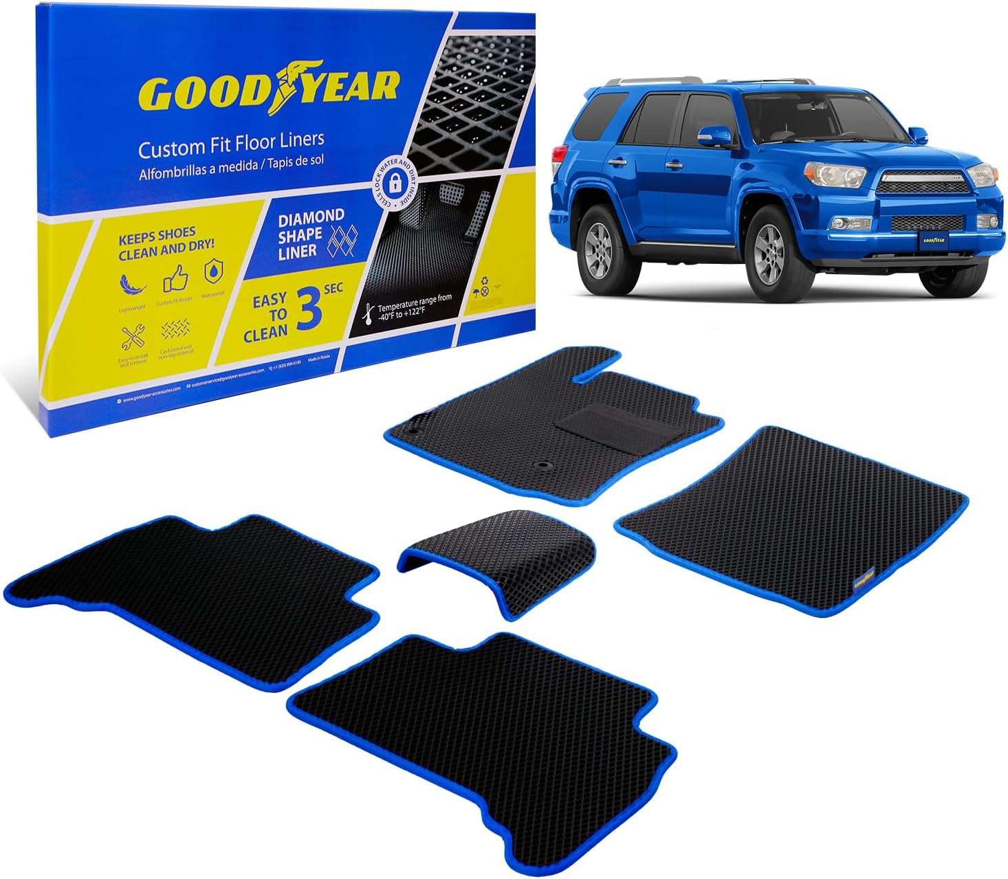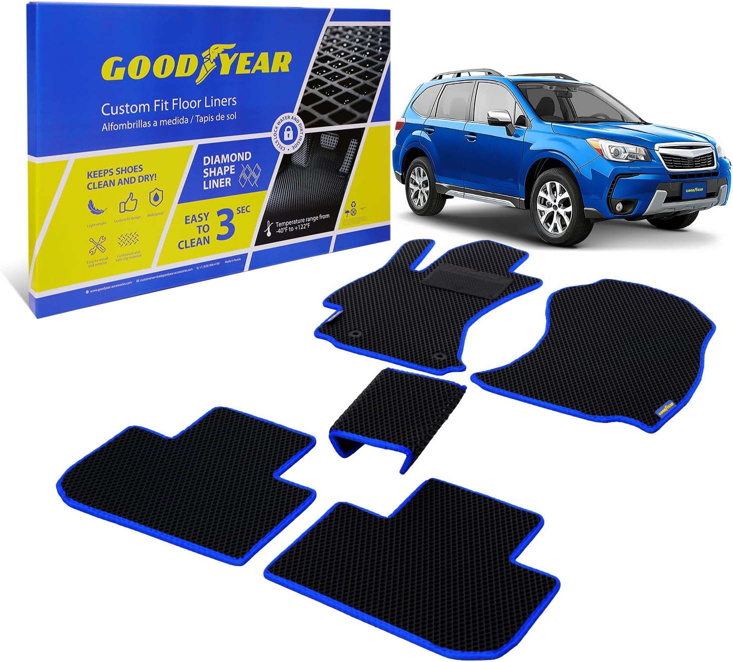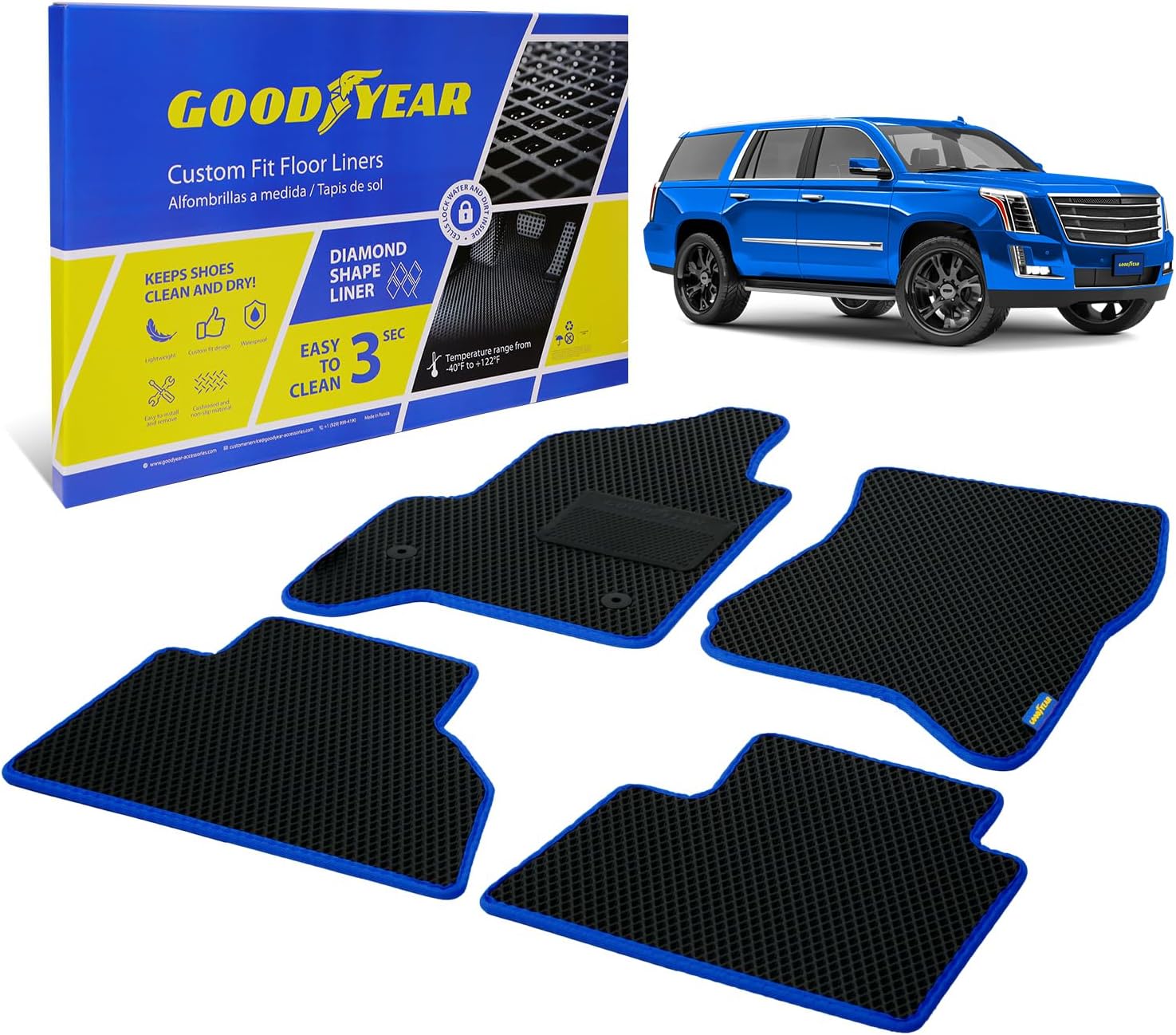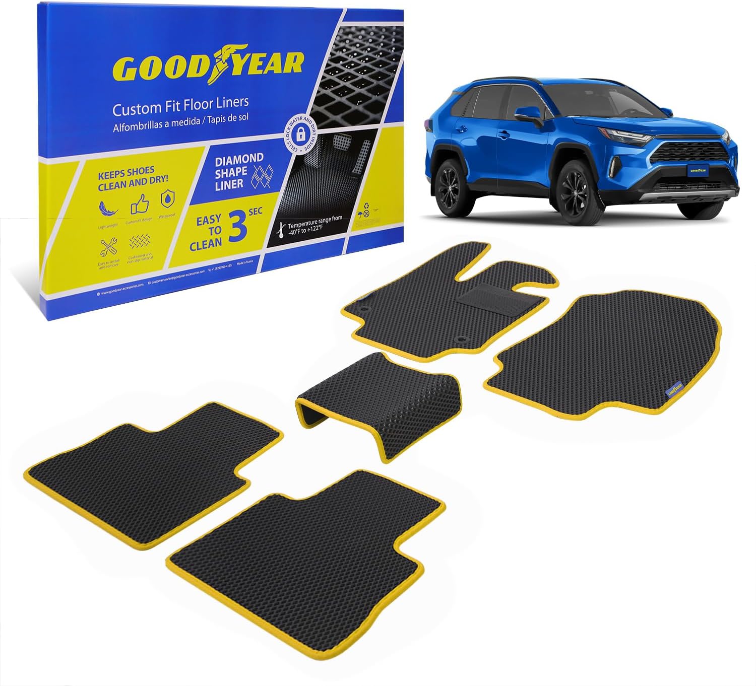 Upgrade your car’s interior with Goodyear all-weather car floor mats – the ultimate solution for protecting your vehicle’s floors from dirt, mud, spills, and wear. Whether you're a daily commuter, weekend adventurer, or truck enthusiast, these automotive floor mats provide unmatched durability, coverage, and convenience. Made with premium heavy-duty, environmentally friendly material, our floor liners feature Diamond Shape technology, effectively trapping water, dirt, and debris to keep your car clean. A slip-resistant backing with secure fasteners ensures these car mats stay in place, even during rugged off-road trips. The reinforced heel pad in the pedal area adds extra durability, making these truck accessories for men and women a must-have for any driver. Goodyear Precision-Fit Floor Mats (Black 4 Pc. Set). All-Weather, Heavy-Duty waterproof mats. Anti-Slip Mesh Backing with Secure Fasteners. Diamond Shape Technology for Maximum Dirt & Liquid Containment. Easy to Clean – Shake Out or Hose Down. Includes Front and Rear Liners. Strong, reliable and permanent car accessories. Bonus: Two (2) Complimentary Goodyear License Plate Frames. Enhance your driving experience and keep your car cleaner with these premium floor mats for SUVs, trucks, and cars. Click Add to Cart now and upgrade your vehicle with high-quality car accessories!