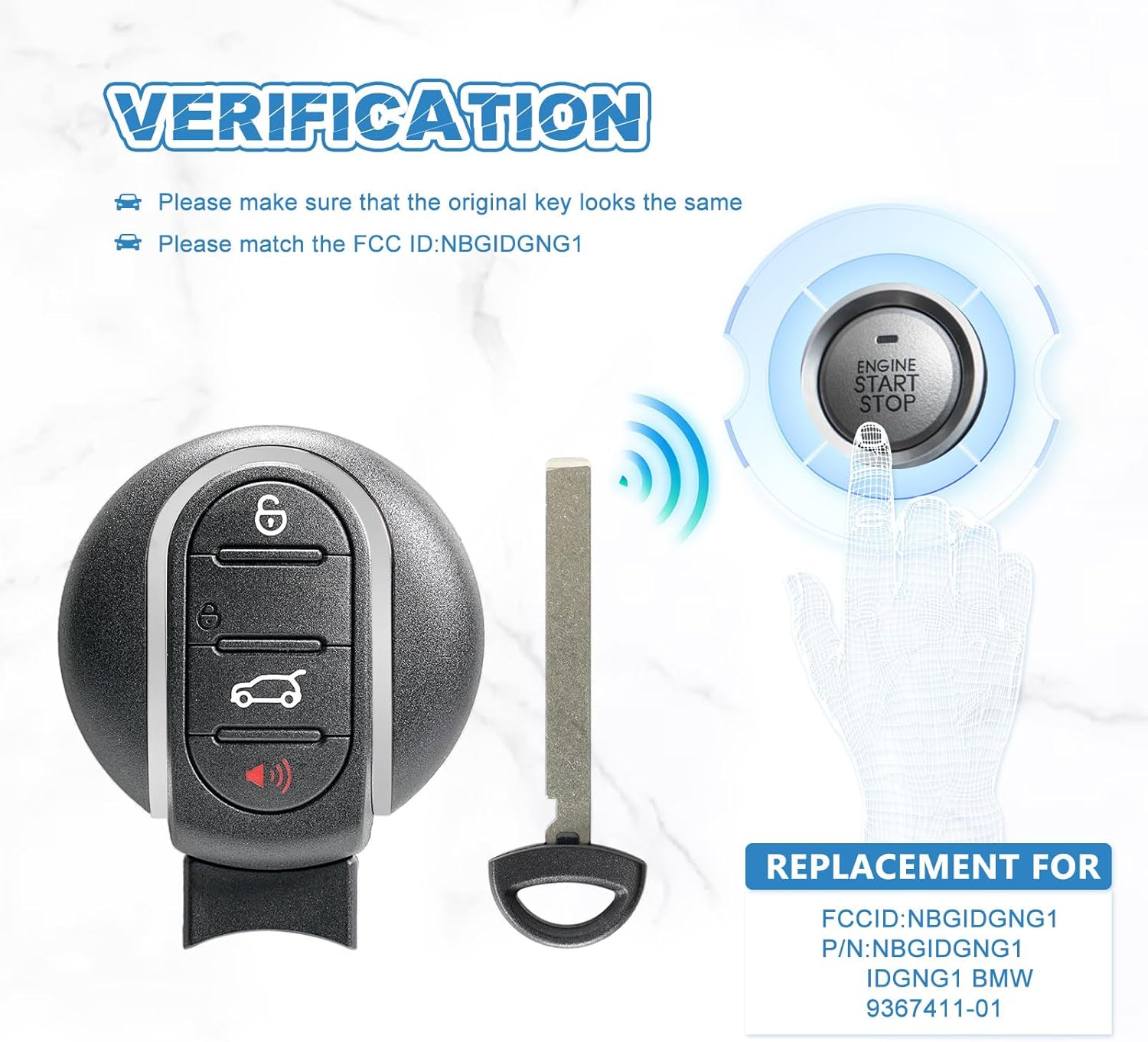 Specification: FCC ID: NBGIDGNG1 P/N: 9367409-01 Hitag3 Chip Frequency: 434 MHz Compatibility: 2015 - 2019 Mini Cooper 2016 - 2019 Mini Cooper Clubman 2015 - 2020 Mini Cooper Countryman 2015 - 2017 Mini Copper Peceman Package Includes: One aftermarket remote key.