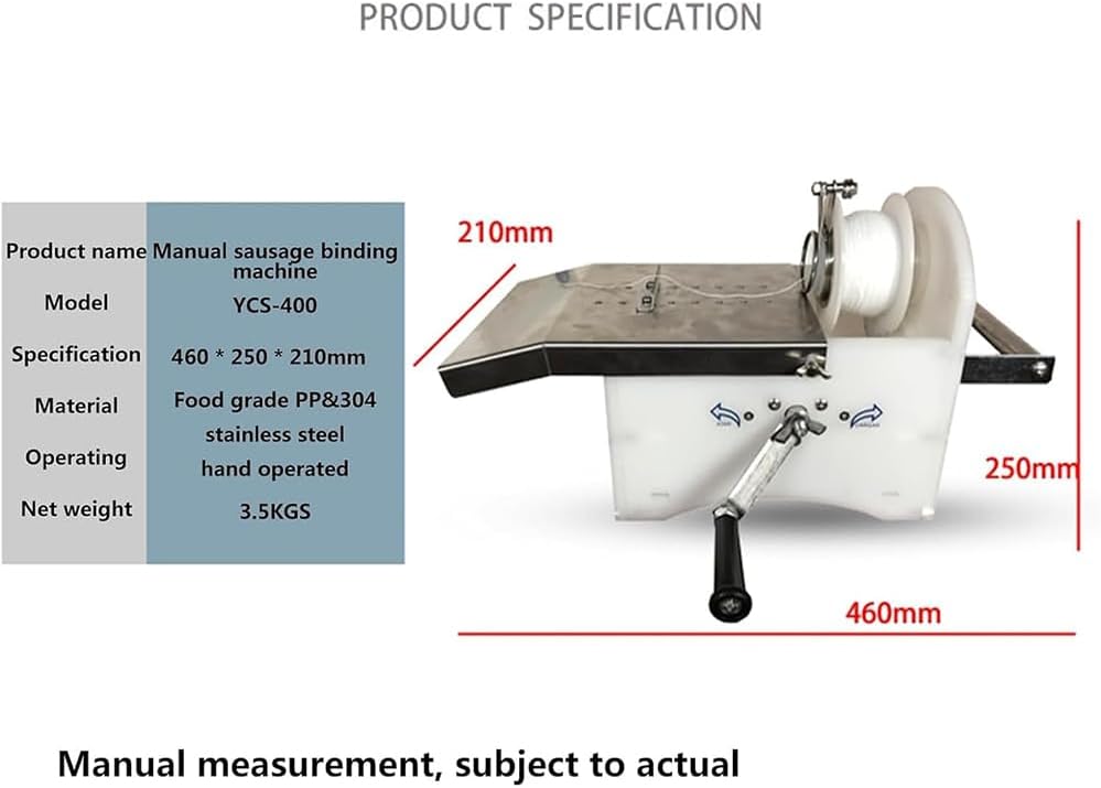 This handle sausage casing tying machine is designed for both home and commercial use, making it ideal for supermarkets, butcher shops, restaurants, and households. Perfect for tying a variety of sausages, this machine offers efficiency and convenience for all your sausage-making needs. Crafted from 10mm food-grade PP material, the body of the machine is lightweight and easy to clean. The plastic handle rotates 360 degrees, allowing for flexible and effortless operation. The operation panel can be tailored to your preferences. Once you've determined the desired size, simply tighten and lock it in place for precise sausage tying. Featuring a high-quality pure copper gear paired with a plastic gear, this machine ensures smooth rolling, durability, and a lightweight design. The tying process is straightforward, producing firm and reliable results. For added stability, the fixing bolts can be secured to your worktable, making it easy to operate. Specifications: - Name: Manual sausage tying machine - Material: Food-grade PP and 304 stainless steel - Size: 450 x 240 x 210 mm - Mode: Manual - Net weight: 3.5kg - Sausage diameter: 0-45mm Package Included: 1 x Sausage Knotter 1 x Thread