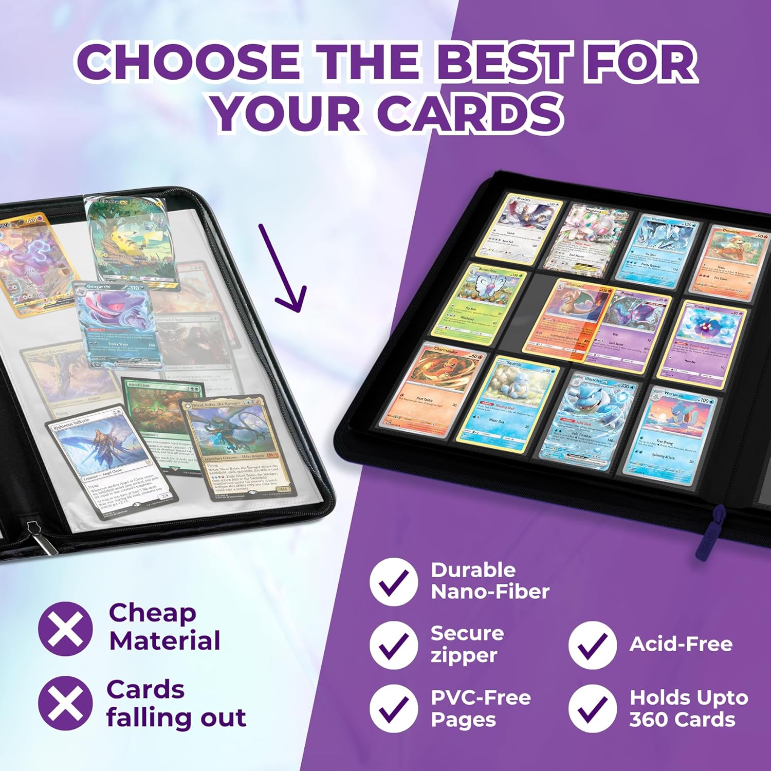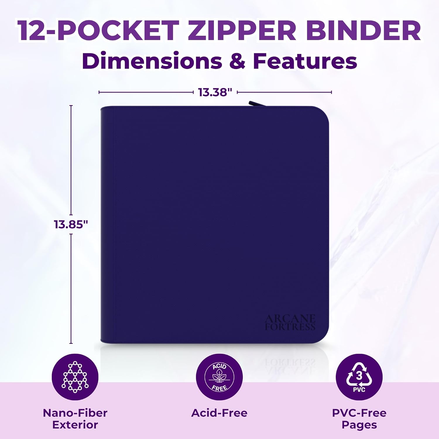 Level up your card collection with the Arcane Fortress MTG Card Binder, a must-have for trading card enthusiasts and collectors. This magic card album combines premium features with a sleek nano-fiber exterior, making it the perfect choice for safeguarding your prized cards. Whether you're storing cards from Magic: The Gathering, Dungeons & Dragons, or any other trading card game, this spellbinder MTG offers unmatched durability and style. With its 9-pocket pages and 360-card capacity, this card storage binder ensures plenty of space for your collection. The side-loading pages are designed to securely hold sleeved and double-sleeved cards, providing easy access while keeping them safe. The zipper closure adds an extra layer of protection, keeping dust, spills, and accidental damage at bay. Perfect for use as a kids' card binder or a professional card collector book, this versatile design suits collectors of all ages. Engineered to protect your cards, the acid-free and PVC-free pages prevent discoloration and damage over time, preserving the value of your collection. Whether you’re organizing an binder, preparing for a tournament, or showcasing your rarest cards, this MTG binder 9 pocket design is built to meet your needs. Perfect for games like Magic: The Gathering, Pokémon, and Yu-Gi-Oh!, the Arcane Fortress TCG games card binder is more than a storage solution—it's a statement of quality and passion. Upgrade your card storage today with the Arcane Fortress Binder Magic, where your cards are always protected and ready for action.