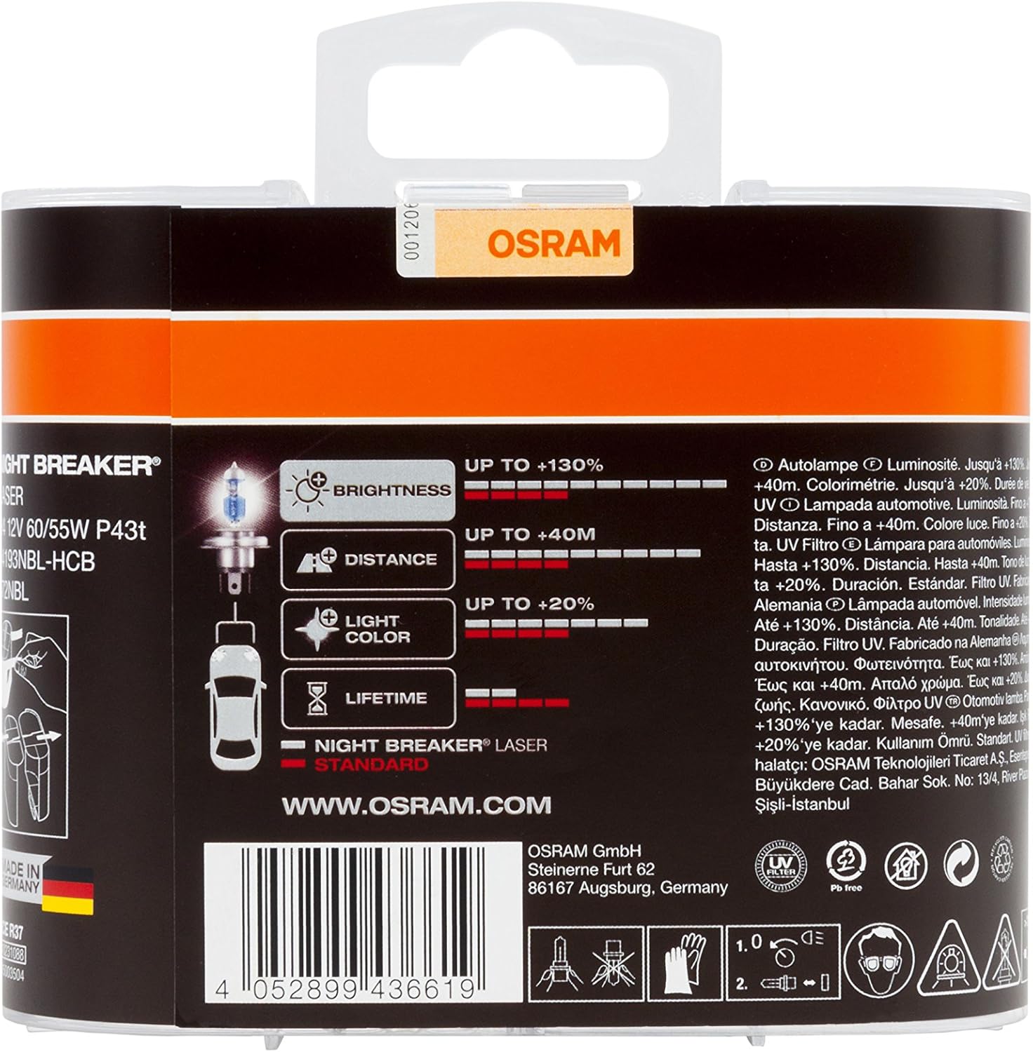 Break the Night High-quality halogen headlight lamp with optimized performance. With up to 130% more light, experience even more intensity than the familiar NIGHT BREAKER UNLIMITED, and a significantly extended light cone! Whether luminous intensity, light cone or light color: The new OSRAM NIGHT BREAKER LASER has broken into new performance dimensions – and is now also setting the benchmark in safety, comfort, and design. The lamp has a unique design with a laser-engraved product name and silver cap on the glass bulb. Groundbreaking in every way: OSRAM vehicle lamps The innovative OSRAM vehicle lamps are characterized by high reliability and maximum quality – and ensure significantly more visibility and safety. Different lamp technologies and product lines offer you the option to select the lamp which best reflects your personal needs and preferences.Trust the number one – just as so many international car manufacturers do OSRAM is the global market leader in the field of vehicle lamps. Each year, half of all globally manufactured cars are equipped with our light sources. Our customers also include the largest international automotive companies. Put simply: With OSRAM you can always rely on lighting solutions that meet ever growing safety requirements and impress with the very highest quality and performance standards.Impressive at a glance:Up to 130 % more light on the road (compared with standard halogen lamps)Up to 40 m longer light cone (compared with conventional halogen lamps)Up to 20 % whiter light (compared with standard halogen lamps)Combination of a highly-developed filament and pure Xenon filling for extra light intensityInnovative laser engraving technology and precise window for better light intensity Unique design with a laser-engraved product name and silver capFor the performance-oriented driverAvailable for all front light functions