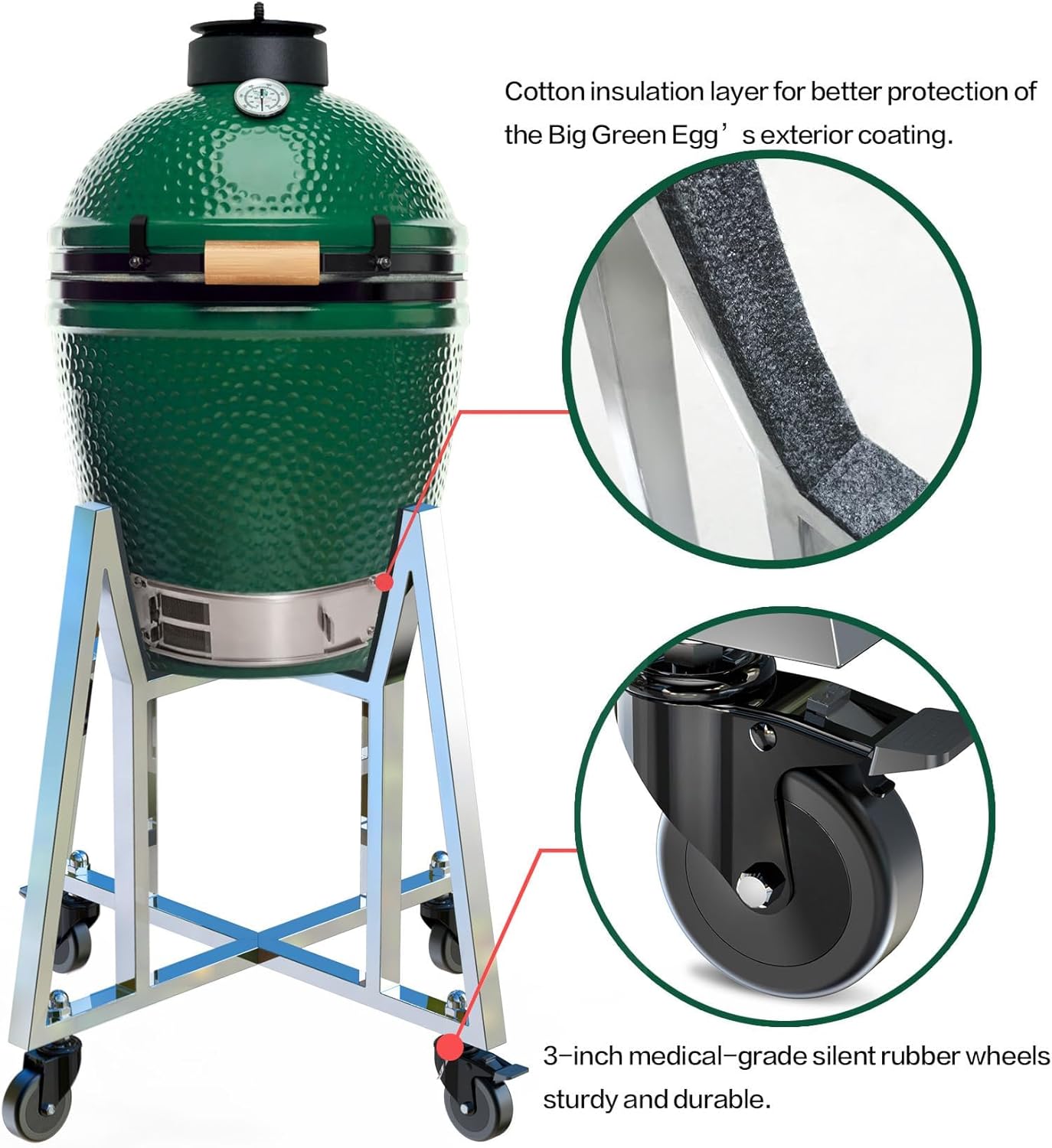 Professional Stainless Steel Nest - The Ultimate Foundation for Your Big Green EggUpgrade your grilling experience with our Stainless Steel Grill Cart, specifically designed for the Large Big Green Egg. While most competitors use powder-coated alloy steel that eventually rusts, our premium stainless steel construction ensures long-lasting durability and a professional aesthetic for your outdoor kitchen.Heavy-Duty MobilityMove your heavy ceramic grill with confidence. Our stand features four 3.0-inch large casters that roll smoothly across any surface. With 2-wheel locking stability, your grill stays exactly where you want it, providing safety and peace of mind during your BBQ sessions.Perfect Fit & ErgonomicsThis stand raises your Large BGE to a comfortable cooking height, protecting your back and making it easier to monitor your masterpieces. The precision-engineered frame holds your egg securely, preventing the shaking or instability often found in generic stands.Product Specifications:Compatibility: Custom fit for Large (L) Big Green Egg (BGE)Material: 100% Stainless Steel (Rust Resistant)Color: Sleek SilverDimensions: 24.4" H x 14" W x 7" DWeight: 12.0 lbsCasters: 4 x 3.0" Polyurethane Wheels (include 2 locking wheels)Frequently Asked Questions:Q: How does this compare to the original powder-coated nests?A: Unlike the original black nests which are prone to rusting if the coating chips, our stainless steel stand is rust-proof by nature, offering a much longer lifespan and a more modern look.Q: Is it difficult to assemble?A: Not at all. We provide all tools and a step-by-step manual. Most customers complete the assembly in under 20 minutes.