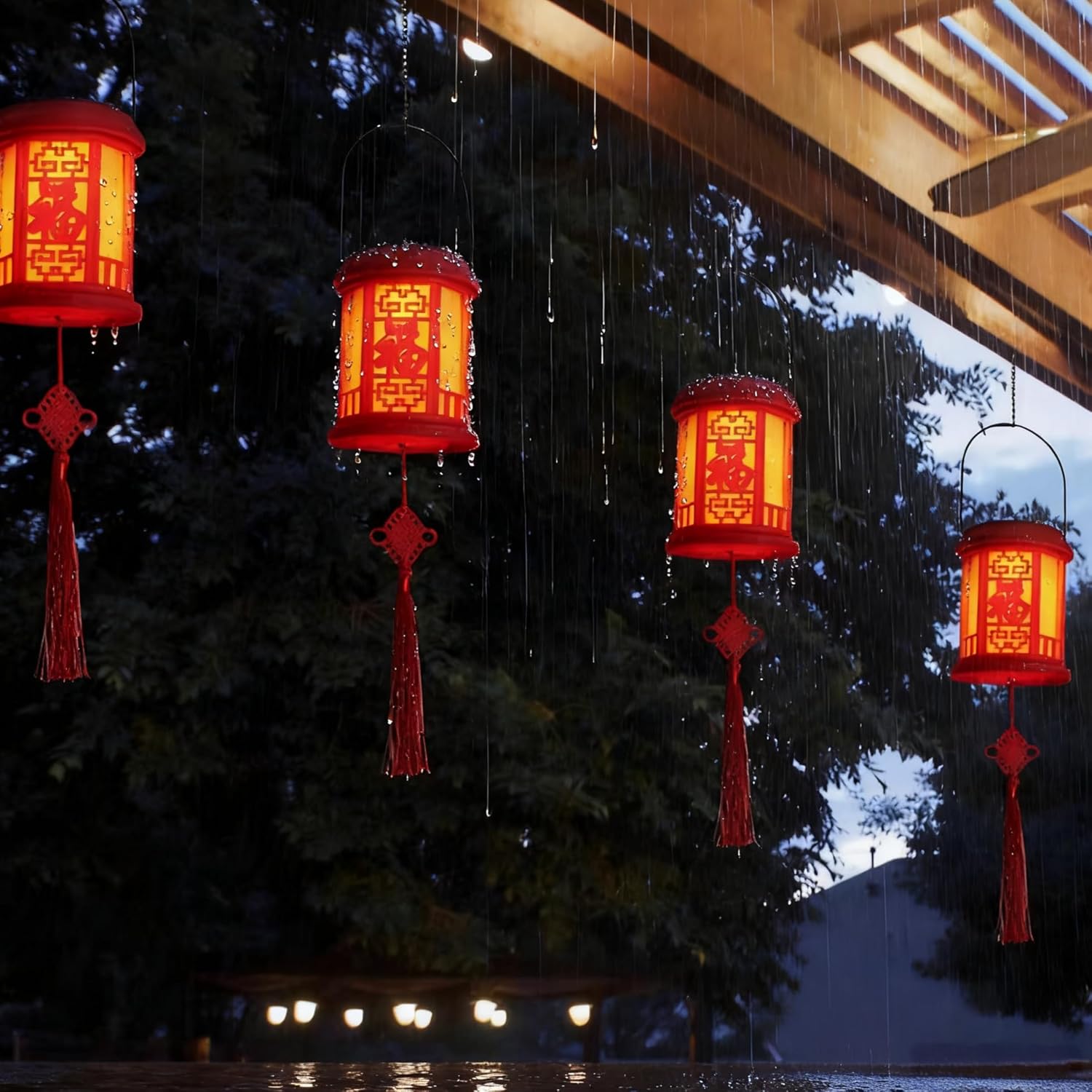 Solar Decorative Lamp This decorative lamp features a vibrant red design, with "Fu" (symbolizing good luck) patterns and Chinese knot tassels, creating a festive atmosphere. It can be charged by sunlight and can be used continuously for 6 to 8 hours. It automatically turns on in the evening and can provide 8 to 12 hours of illumination when fully charged. Its waterproof rating reaches IP65, making it suitable for outdoor environments such as gardens and balconies. Even in rainy days, it can be used. It comes with a hanging chain and does not require wiring, making installation extremely simple. It is perfect for Chinese New Year decorations or adding a touch of Chinese style to daily spaces.