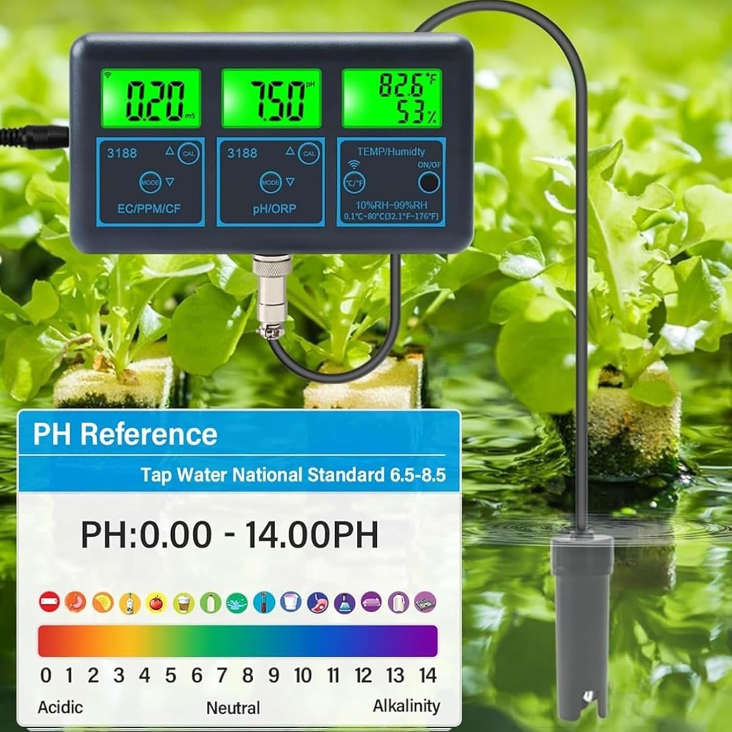 Product specifications: - It's small and simple to set up and use. Therefore, they are ideally suited for all continuous monitoring applications. - Continuously monitors and displays solution pH and EC readings on an easy-to-read LCD. - Suitable for agricultural, horticultural and hydroponic applications where pH and EC levels must be continuously monitored for optimal plant growth. - Please keep the instrument dry and keep the environment ventilated and dry when using it. Product name: Water quality tester pH value: 0.00~14.00pH Conductivity: 0.00~20.00mS/cm CF: 0.1~199.9CF Total dissolved solids: 0~9999ppm Temperature: 0.1°C-60.0°C, 32.1°F-140.0°F Oxidation-reduction potential: -1200mV~+1200mV Humidity (air): 10%RH-99%RH pH value: 0.01pH Conductivity: 0.01mS/cm CF: 0.1CF Total dissolved solids: 1ppm Temperature: 0.1°C/0.1°F Oxidation-reduction potential: 1mV packing list 1 * Water quality monitor